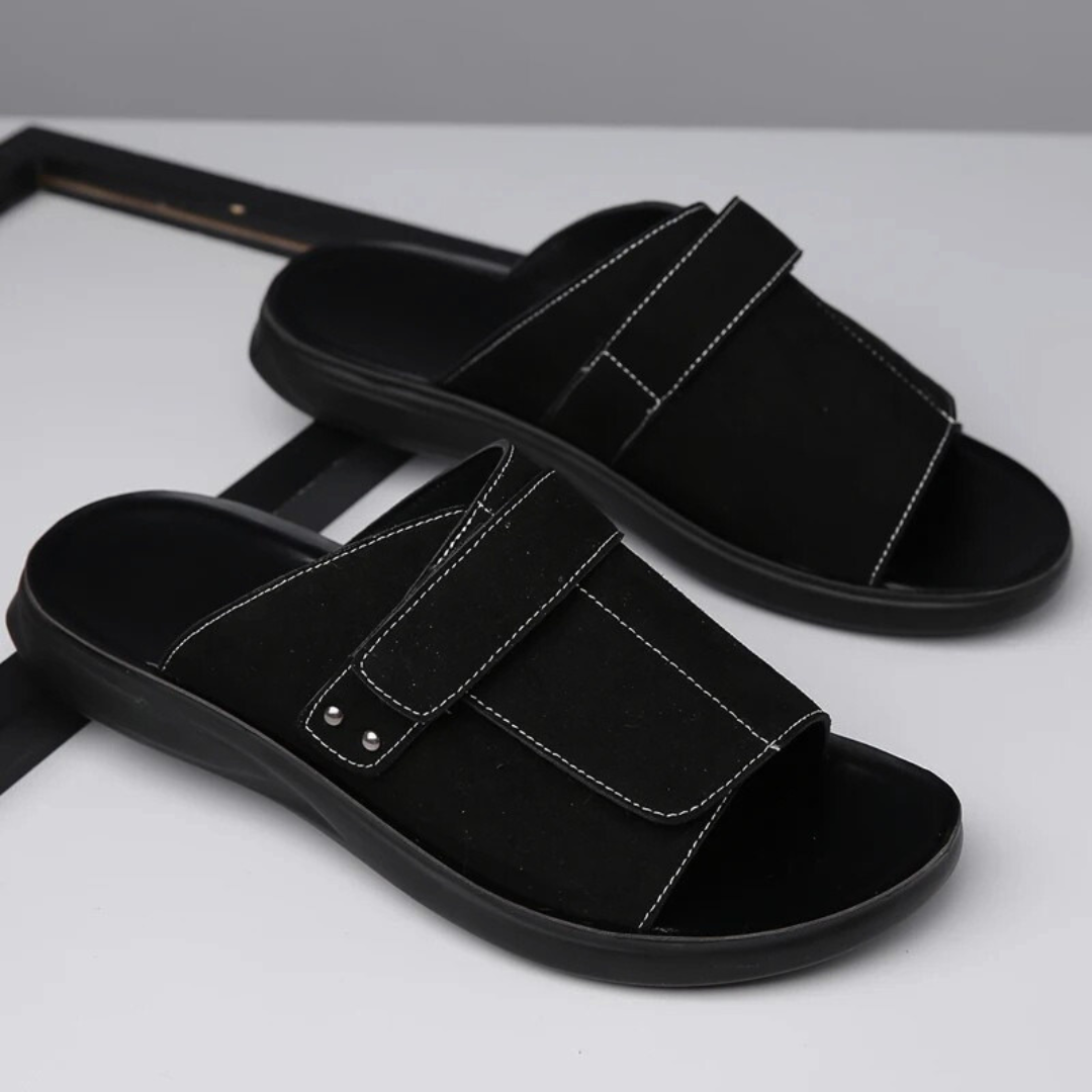 Our Hafford Slides feature a sculpted suede-look upper with hand-sewn contrast stitching and a precision-set adjustable strap for elevated fit and form. Underfoot, the pressure-relieving cushioned sole and impact absorbent footbed supports your every step—lightweight, contoured, and ready for anything.  Built for the daily grind or slow Sundays, they bring premium energy without trying too hard.
